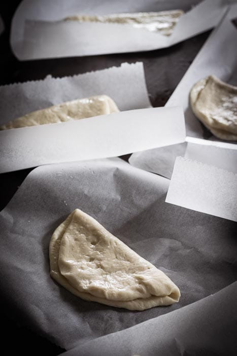 - Vet de chopstick lichtjes in en plaats in het midden van het geplatte deeg. Vouw de deeglap over het stokje om de broodjes te vormen. Haal de chopstick uit het deeg en plaats je ongegaarde bao bun op het bakpapier. Herhaal met de andere deegbolletjes. Plaats de afgewerkte buns met voldoende onderlinge afstand op het bakpapier en laat nog 45 minuten verder rusten onder plastic folie.