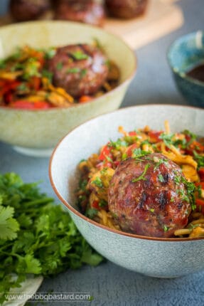 Here we go! After the delicious Vietnamese meatballs I’m sharing a delicious side dish to serve them with! Using a wok pan on the grill works excellent. So I’ll take a moment to explain how you can make this BBQ Stir Fried noodle salad on the grill. It’s easy and a nice extra option to explore!