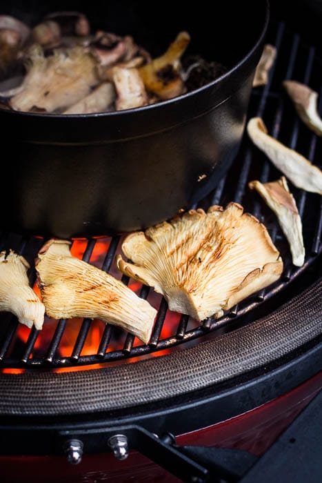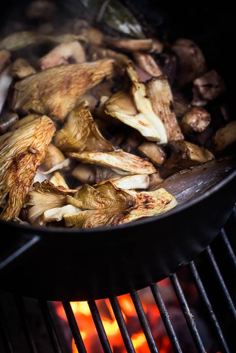 - Grill de oesterzwammen en sjalotten tot ze mooie grillmarks hebben.