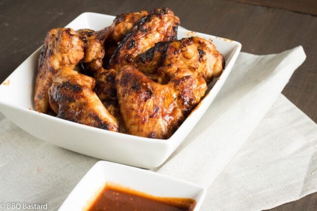 - Net voor het serveren plaats je de kippenvleugeltjes opnieuw boven de directe hitte zone zodat de saus mooi kan karameliseren.