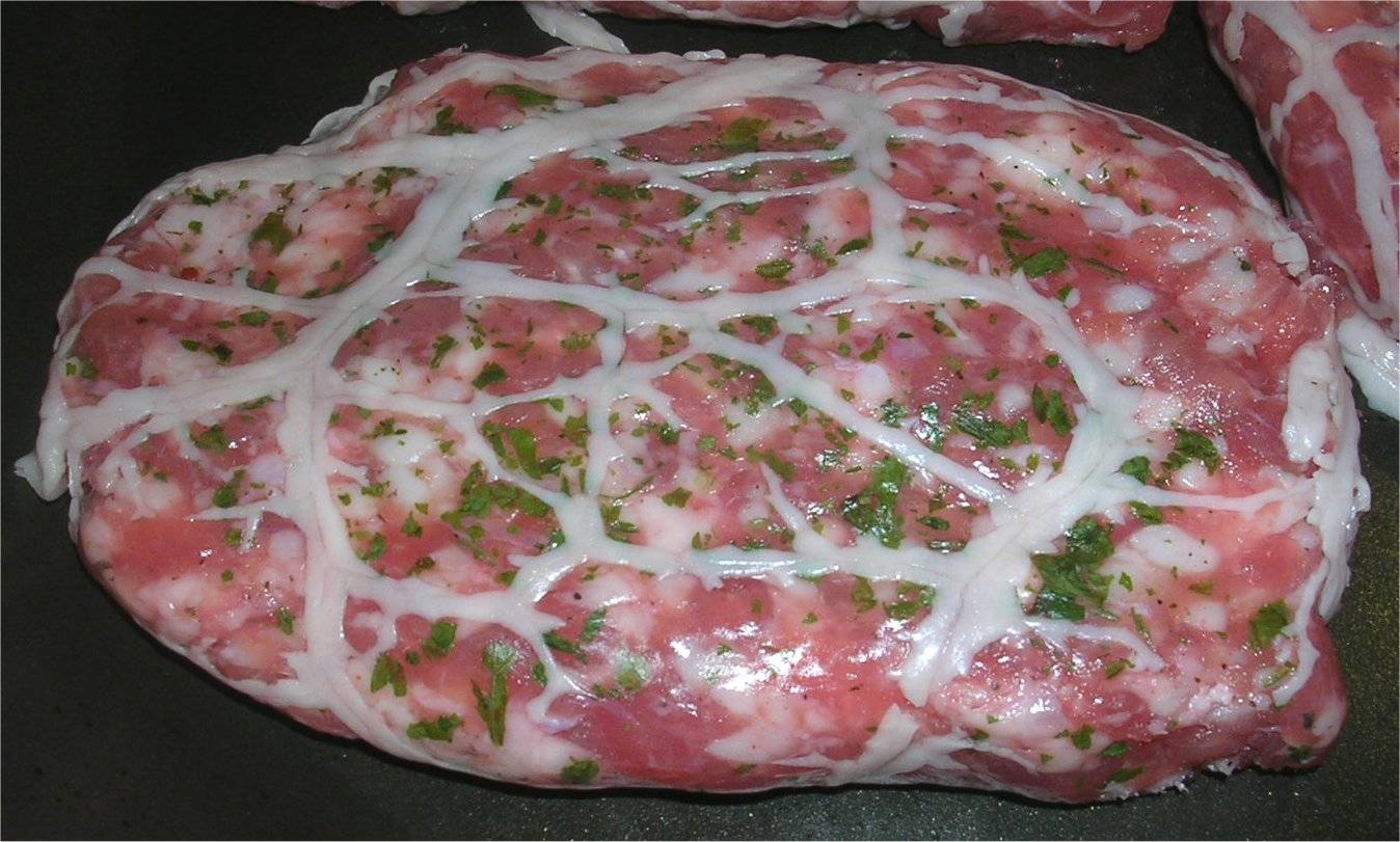 In this recipe I replaced the “Cepes” by Shiitake Mushrooms (btw: check this fantastic post on the wonderful cepes). Simply because I don’t have a forest nor the knowledge to pick my own Cepes. Moreover I couldn’t find any at the store either… BUT!! They did have some Shiitake and those happen to be my favorite Mushrooms. The other change I made was dropping the garlic level… He probably removed the garlic before mincing the cooked spinach. I’m just realising this while typing. Anyway I decided to use 4 times less garlic. Believe me! It was more than enough! I also used a little less shiitake and spinach. I was afraid the balls would fall apart since I had no “crépinette”. I don’t know if that’s a correct english word (A kind person told me it’s caul fat. Thanks for the intervention!). If not “Crépinette” is the peritoneum of the pig and looks like this: