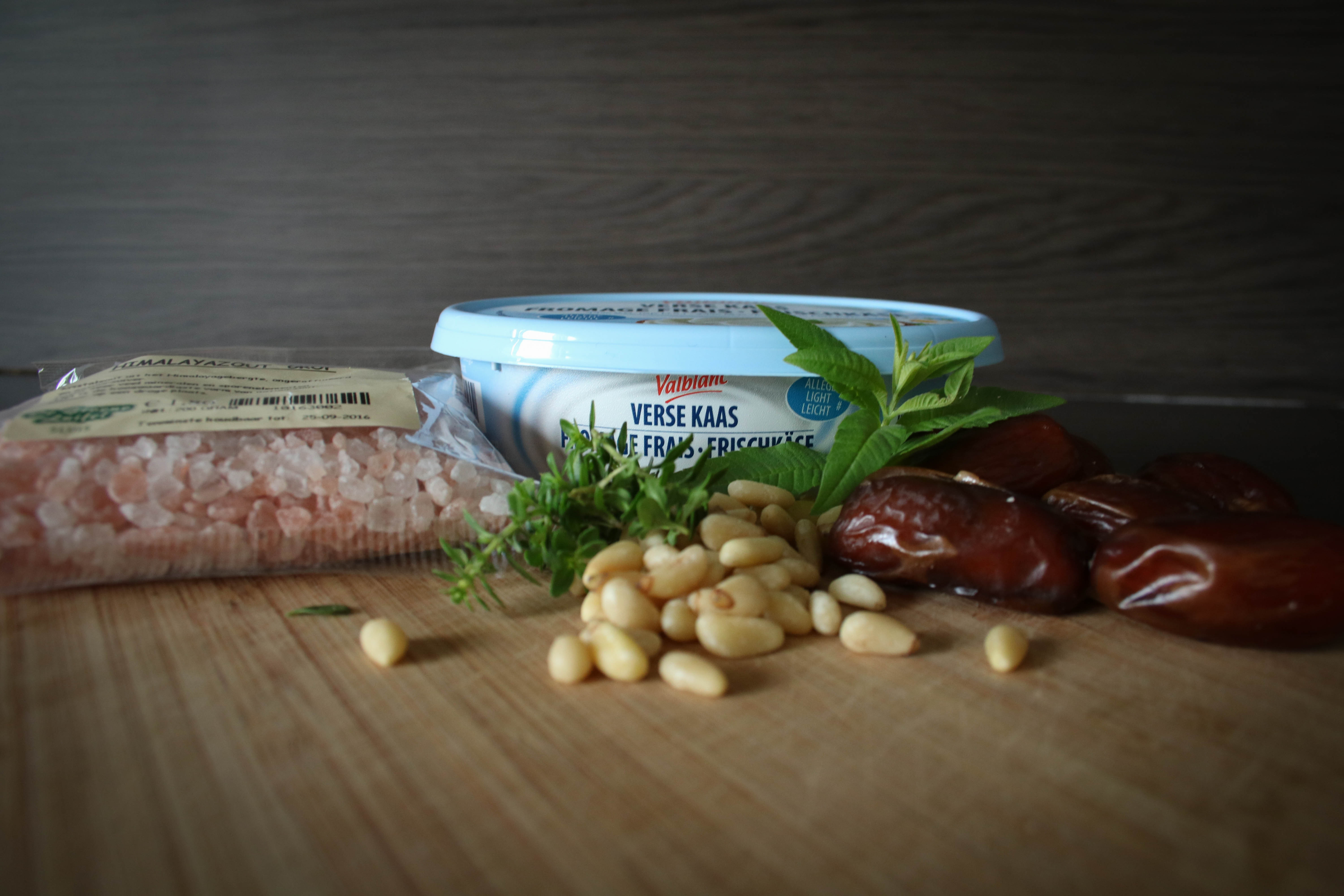 The filling is made by mixing the fresh cheese with baked pines, chopped dates and finely sliced Lemon thyme and Verbena. You can add some salt and pepper at taste. This filling has a fresh lemon taste that combines well with the heavy sweetness from the dates! I’m thinking about stuffing some dates with this mixture and wrapping them with bacon to serve as appetizer.
