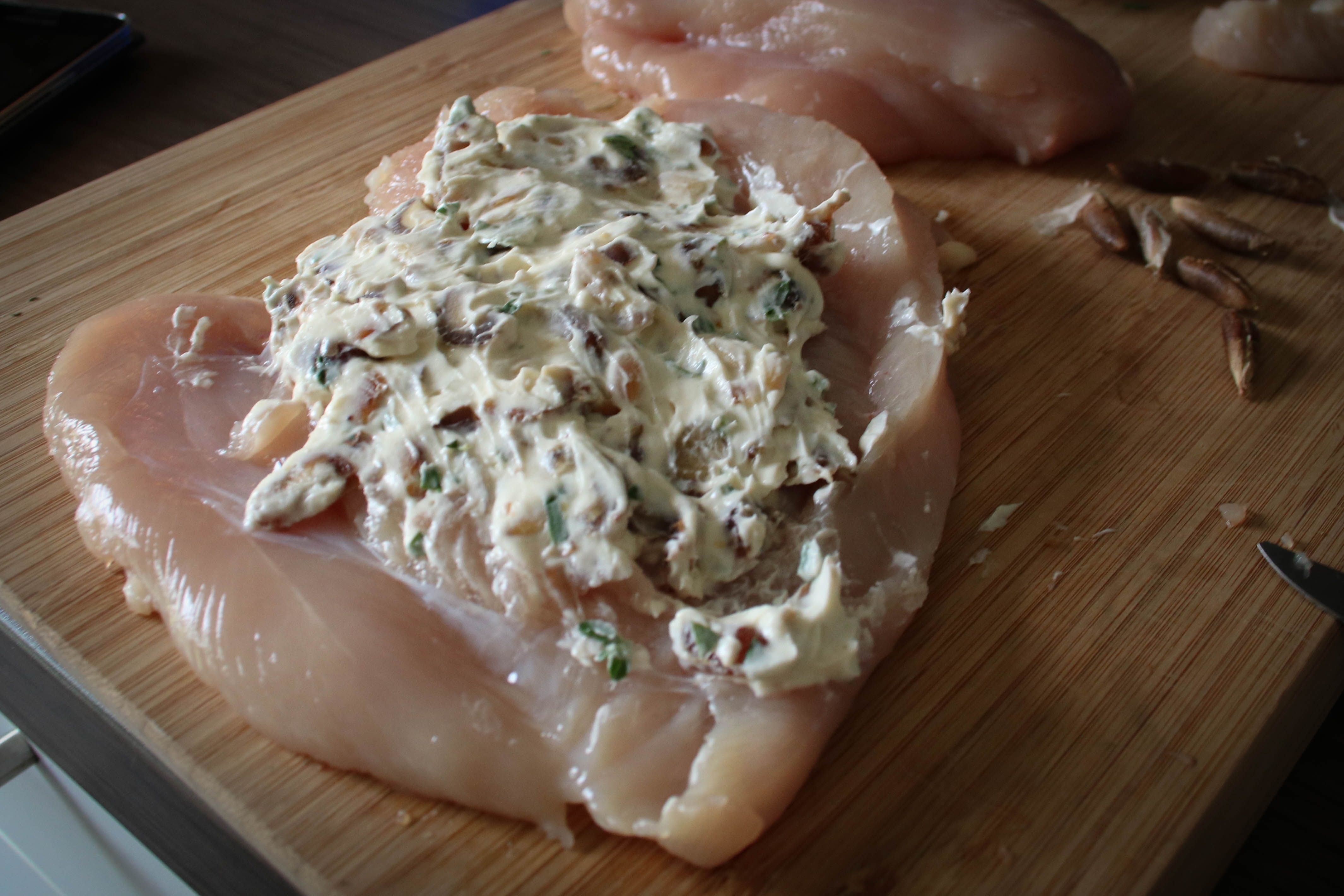 Before you start preparing this dish you could choose to brine the chicken breasts. We’re not so good in planning things… This recipe was made on a late call for food… We just cured them with salt and pepper after preparing them as envelopes and before stuffing them. While you’re preparing the breasts you can preheat the BBQ at 200°C or 400°F (direct heat)