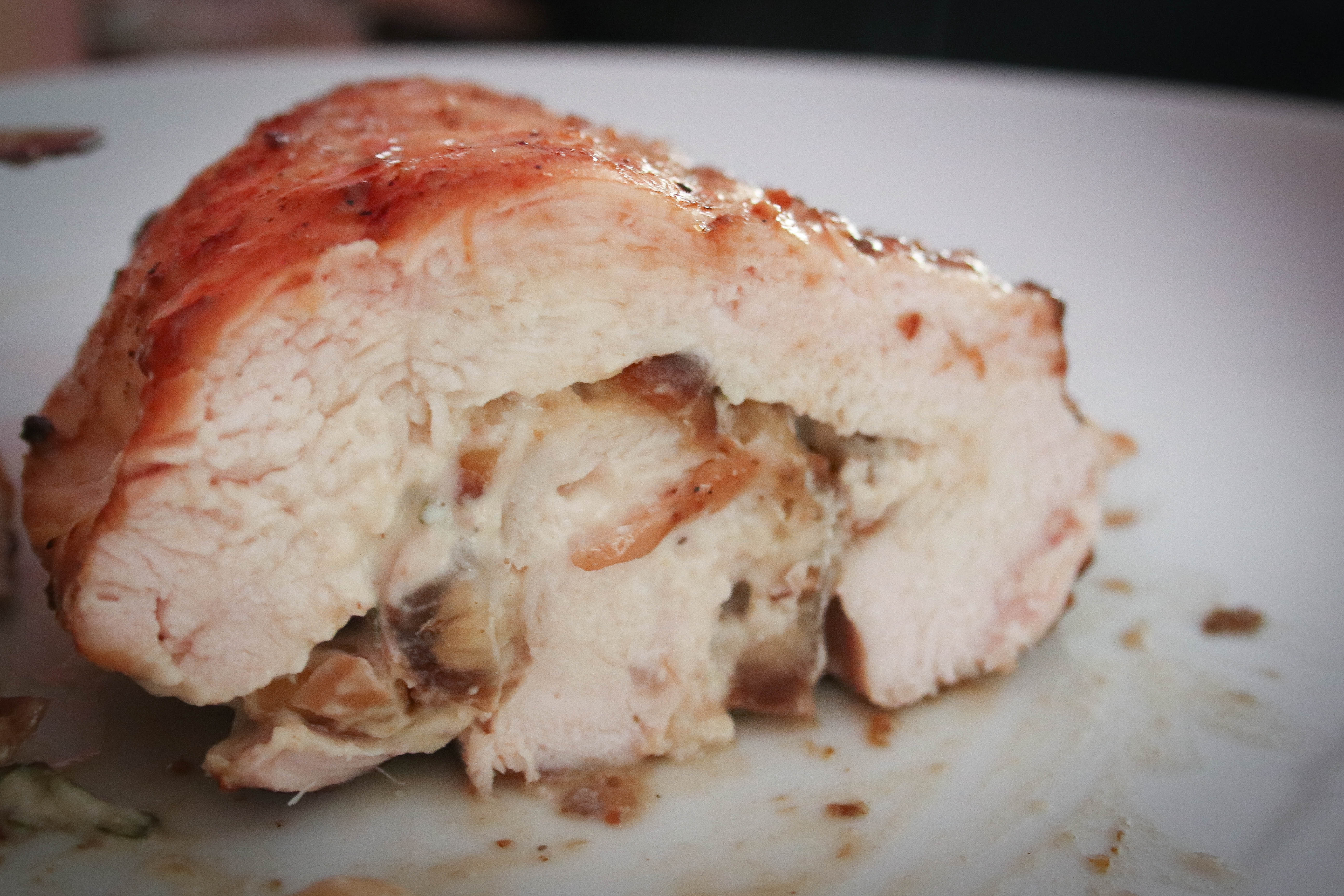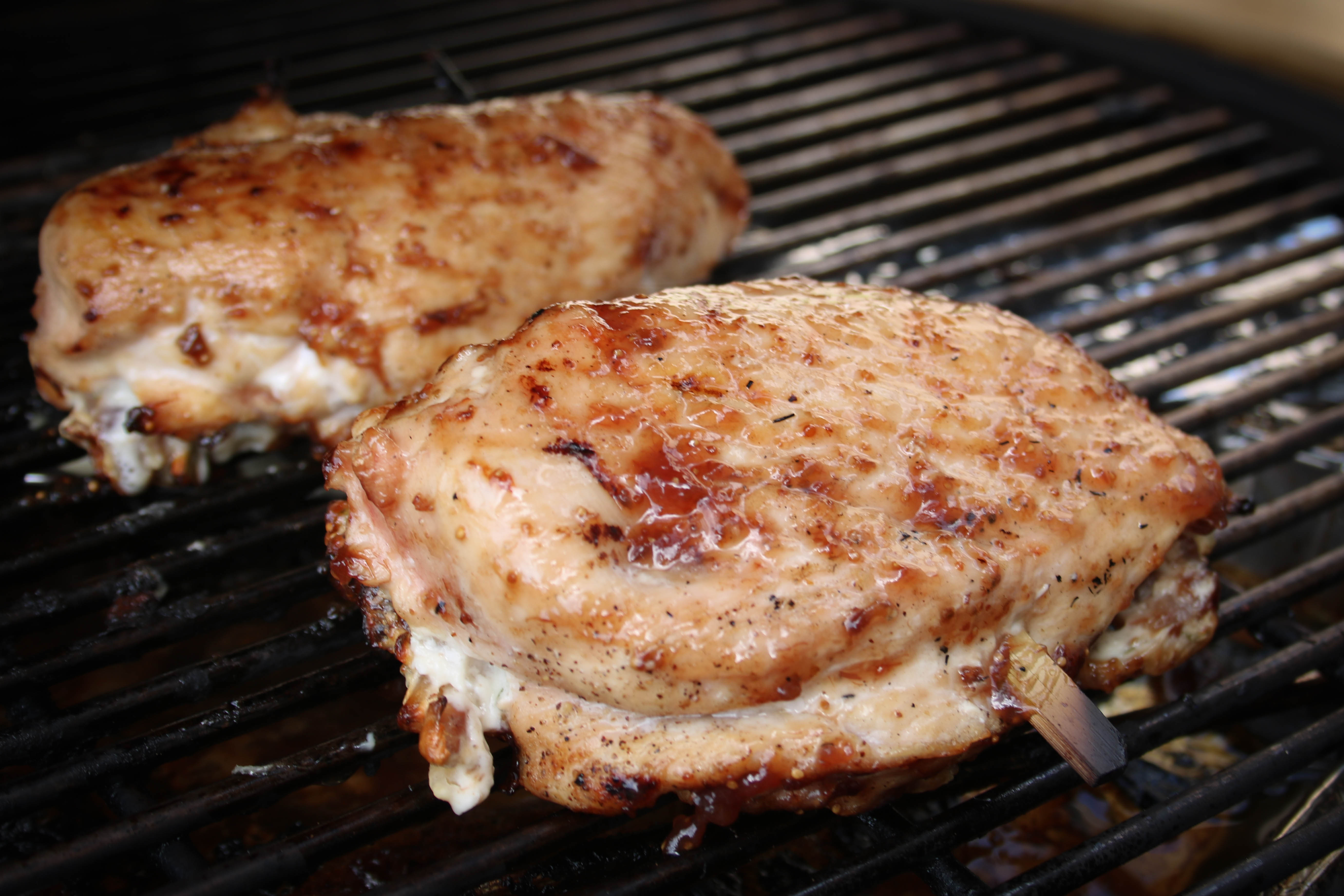 Now remove the breast from the BBQ. Put in a platesetter or heat shield to convert your BBQ for indirect heat. When using a kamado you will see the grate temperature drops. I aimed for 150°C or 300°F. Now you’re save for some time. The breasts are ready when they reach an internal temp. from 70°C or 160°F. Be careful not to measure the cheese or you will end up wrong… When you see you’re getting near 50°C you can start glazing the breasts with fig jam. I only used a thin coat and in my opinion it didn’t need much more. Otherwise I fear the sweetness would overrule the chicken. That’s not what we want! So here’s the result: