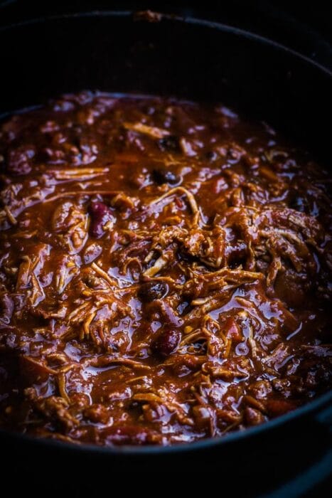 - Eenmaal je vlees de kern van 74°C heeft bereikt voeg je het toe aan de sudderende chili. Laat het geheel verder garen gedurende 2-4 uur, tot het vlees volledig uit elkaar valt.