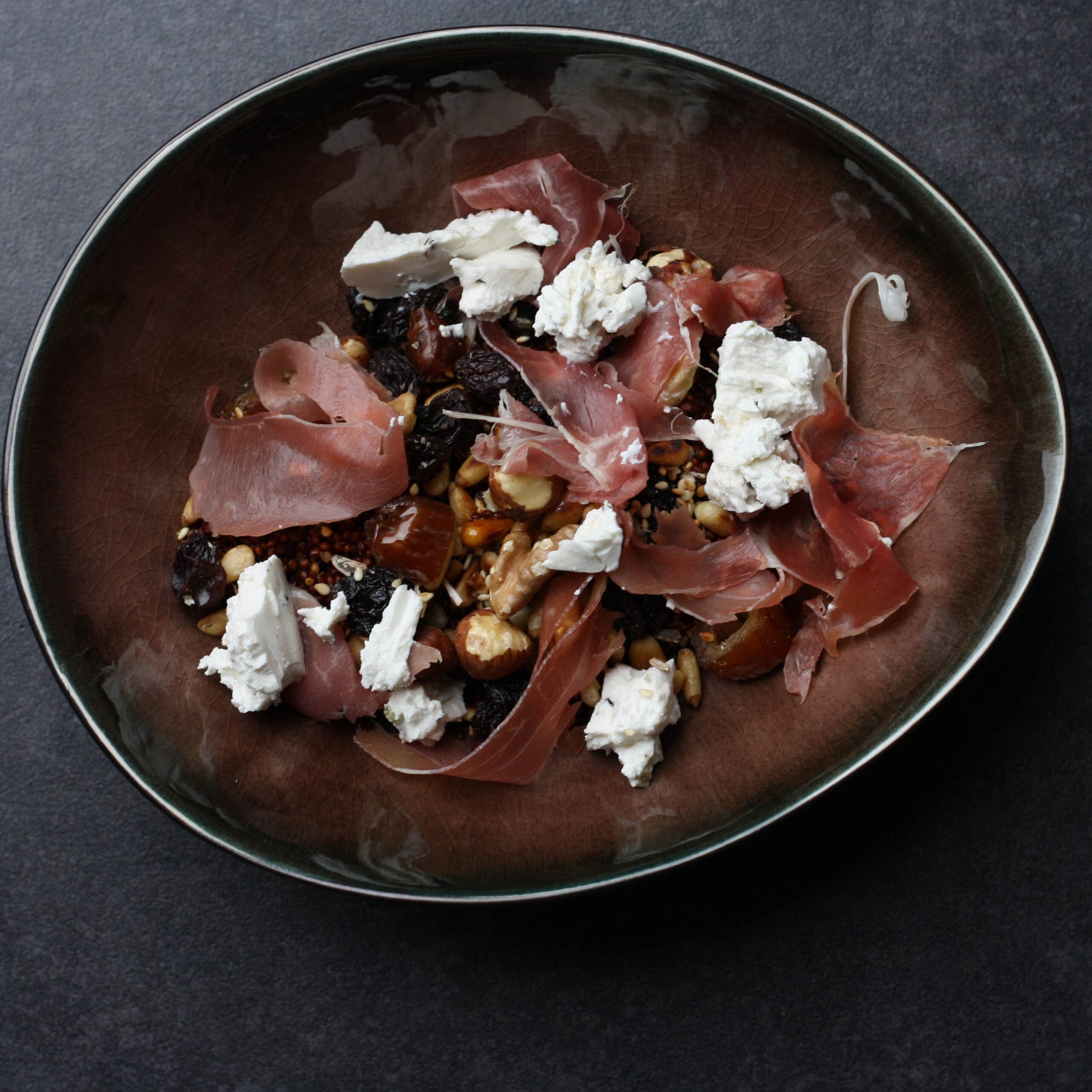 This delicious dates quinoa salad for instance I made last year in the summer time. I remember it was hot that time of the year. Back then we went cycling frequently and were searching for powerful healthy food leading to this meal. We found out this recipe combined well with smoked meat like these “Smoked Pork Cheeks” instead of the parma ham. If you’d like to go for a vegetarian meal you can also skip the meat (don’t haha). No seriously it would taste good too but this quinoa salad with dates could use something hearty.