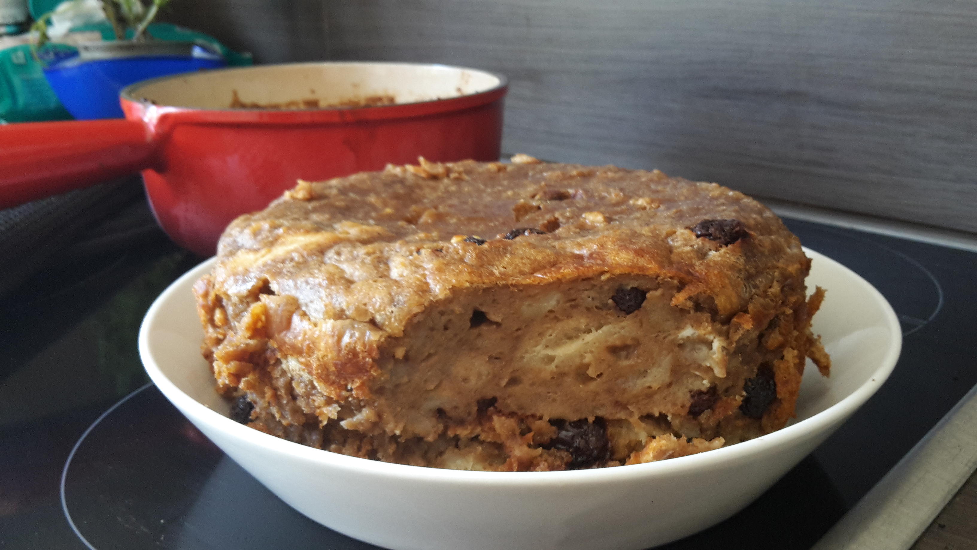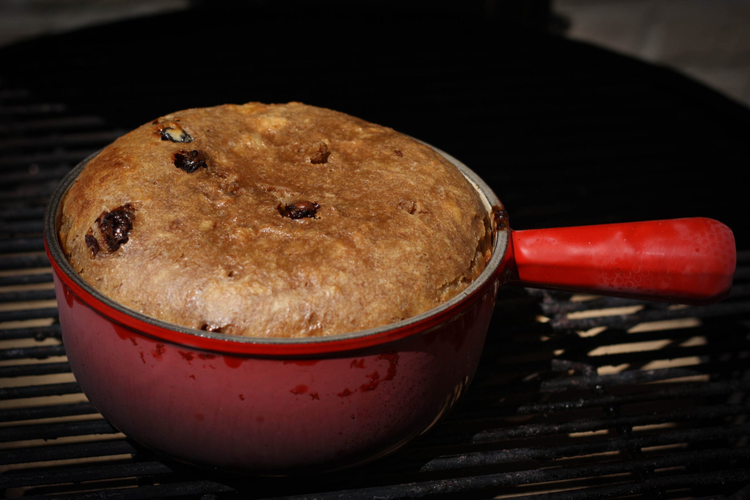 Put the baking mold in your bbq over indirect fire for about 50 minutes! The breadpudding is ready when your knife or a needle stays clean after piercing the dough. Place a plate on top of the Breadpudding and turn it upside down to remove the cake from the mold. You can choose to serve hot with some ice cream, or you can put it aside for about an hour to let cool the cake cool down.