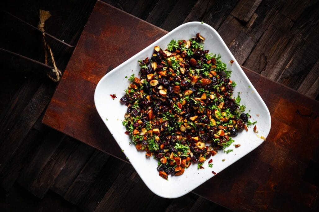 - Hak de gewelde veenbessen en meng deze onder de geroosterde amandelen, grof gehakte peterselie, zout en olijfolie in een kom. Gebruik bij het serveren op kamertemperatuur.