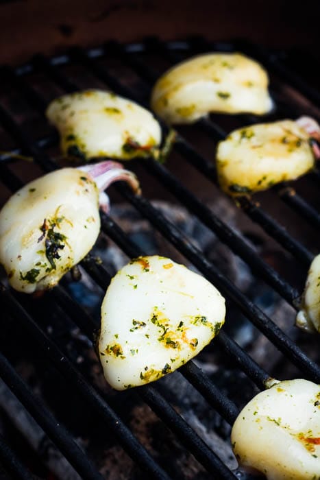 - Before serving sprinkle some drops of lime juice on top of the grilled squids and grate some fresh zest over it. Add some salt and pepper at taste but be careful with this! You don't want to overpower the delicate taste of the marinated and smoked baby squids!