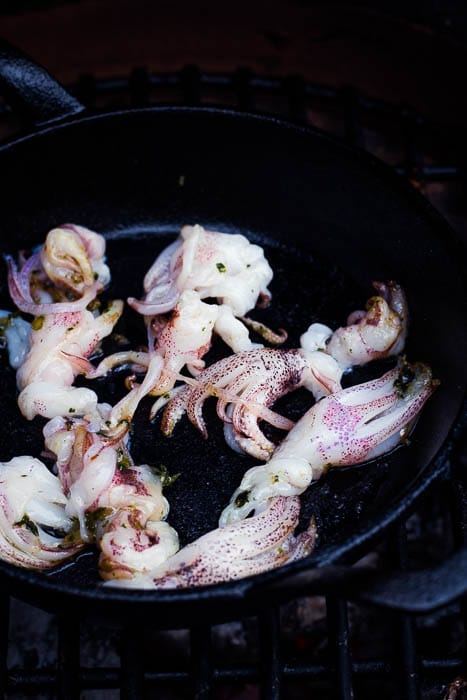 - Smoke the baby squids with their marinade for 30-45 minutes.