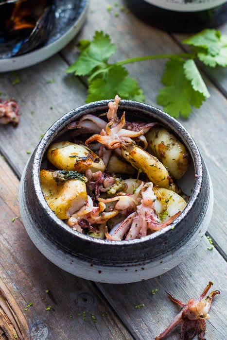 Some moments will last forever! Imagine a rainy day. A slight panic slipping through your veins. Until a half hour before your guests arive the sun finally beats those dark and rainy clouds! It’s BBQ time! Instagram Foodie and wine lover @The_taste_athlete is coming over to pair some wines with some of my new recipes. And how! With these tiny smoked squids I served as an appetizer he served us a stunning natural wine by Marceau le Blanc (2017). Foodpairing at it’s finest! This dude knows his wines! But hey… You don’t want to miss this delicious snack either! Take a quick look, ‘cause these smoked squids will set the tone for a perfect night!