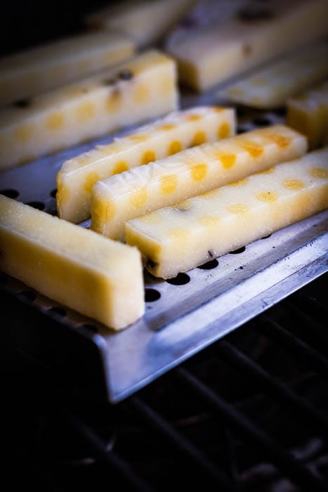- Snij de kaas in staven van 1 a 2 cm dikte. Rook de kaas gedurende minimum 3 uur (of langer naar eigen smaak). Zorg ervoor dat de kerntemperatuur in je BBQ niet hoger wordt dan 20°C anders gaat de kaas zweten.