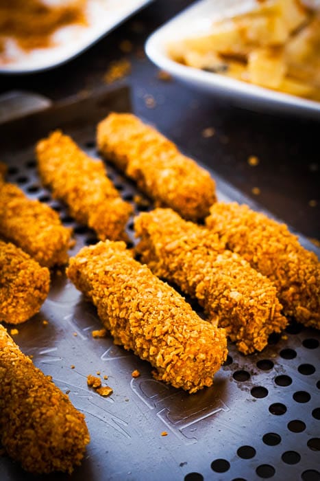 - Verwarm de air fryer voor op 200 graden celsius en spray wat zonnebloem olie op de kaassticks. Frituur de gerookte nacho cheese sticks tot de korst krokant is en de kaas gesmolten (afhankelijk van de kaas 1 a 5 minuten)