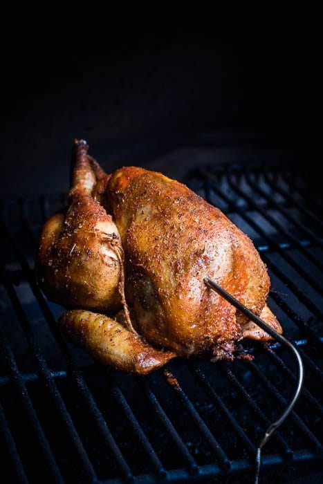 - Rook de Parelhoen tot je een kerntemperatuur bekomt van 50°C. Voeg hiervoor enkele chunks rookhout toe tussen de kolen indien je geen gebruik maakt van een pelletsmoker.