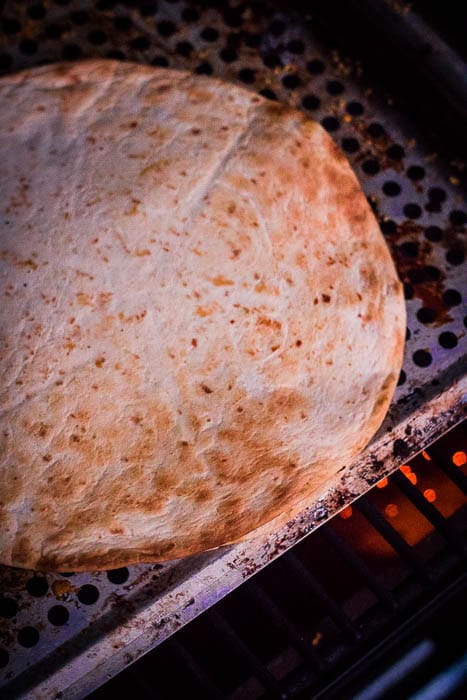 - Plaats het gehel op de BBQ tot de kaas gesmolten is en de Linzen Quesadilla mooi goudbruin kleurt.