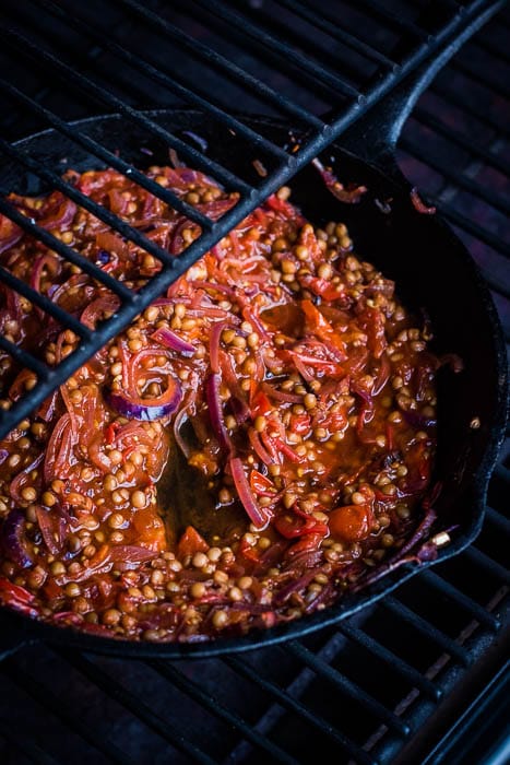 - Voeg de linzen toe en laat nog vijf minuten mee garen in de saus.