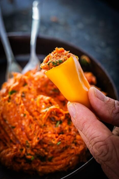 De mini puntpaprika’s zijn veelzijdige ingrediënten die in dit recept prachtig tot hun recht komen. Ze zijn perfect voor het vullen en roken op de BBQ, waardoor hun zoete smaak en knapperige textuur extra benadrukt worden. Deze paprika’s voegen niet alleen kleur en smaak toe in een gerecht maar zijn ook erg geliefd bij onze kinderen. Vooral mijn oudste zoon zou een bakje van deze mini-paprikaatjes (of snoeppaprika) zo naar binnen spelen! Je hoeft ze dus zelfs niet te vullen om mee te nemen op reis.