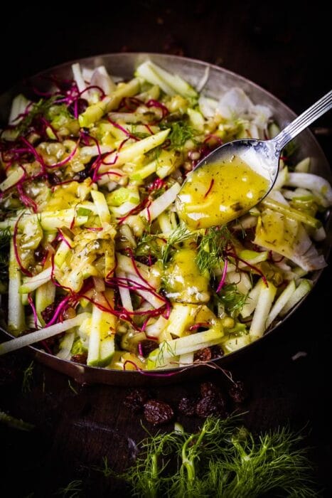 - Plaats de venkel, appel en rozijntjes in een diepe mengkom en meng de dressing onder het geheel. Proef en breng op smaak met peper en zout.