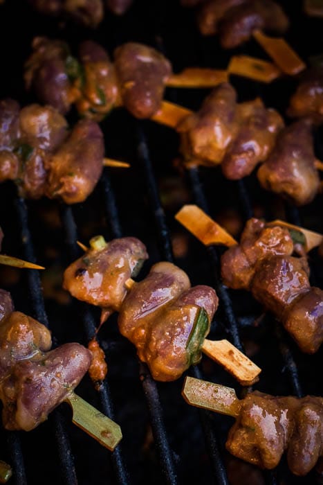- Skew the chicken hearts about 3 per skewer and marinate them for at about 6 hrs.