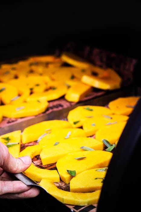 - Verwijder de schil van de butternut pompoen en snij in schijven van ongeveer 0.5 cm dik. Bestrijk met de walnoot olie en breng op smaak met grof zout. Snipper de salie over de pompoen en rooster in een BBQ op een temperatuur van 200°C tot deze goudbruin kleuren. Dit duurt ongeveer 45 minuten.