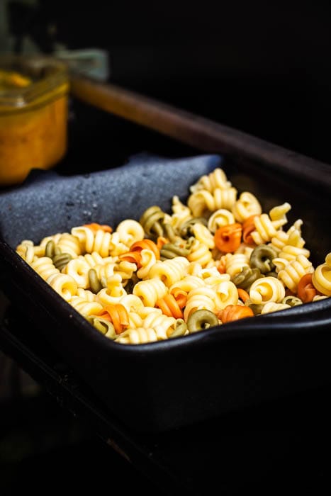 - Kook de pasta volgens de instructies op de verpakking in gezouten water. Spoel de pasta en laat afkoelen. Plaats deze vervolgens in een ovenschaal.