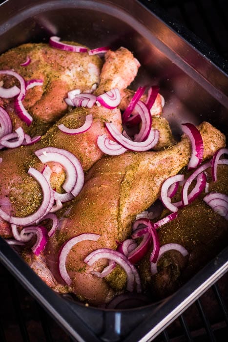 - Place the chicken legs in the tray on the BBQ and slowly cook to a core temperature of 74°C.