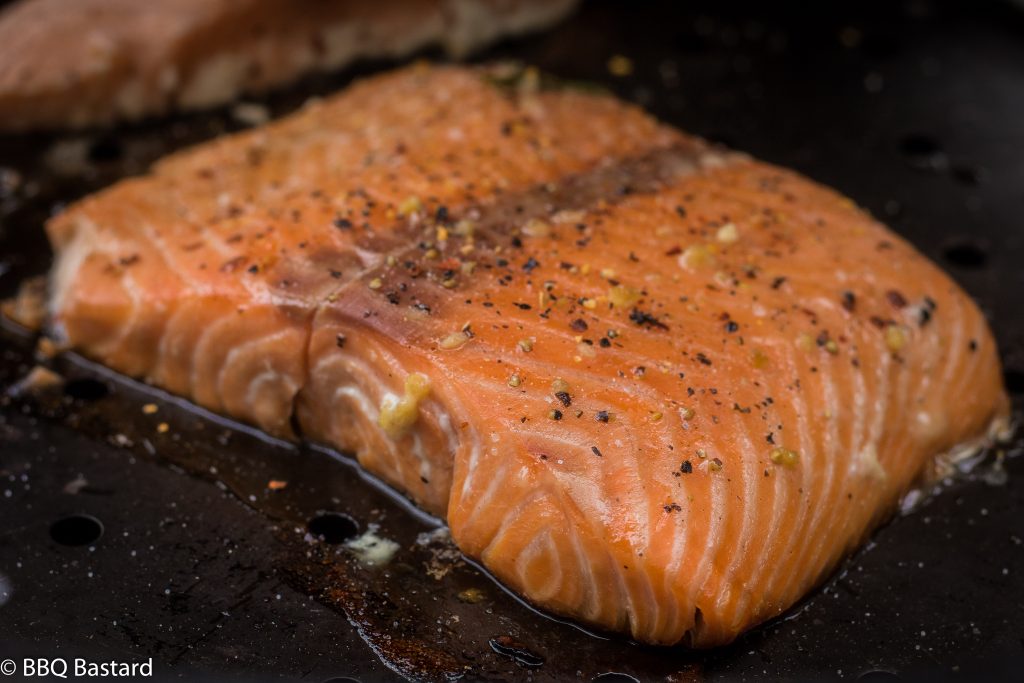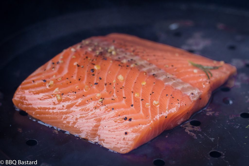 The syrup was spiced with lemon pepper, a rawit pepper, rosemary and lemon juice. It brings a sticky layer of taste to the salmon before smoking. The flavors go deeper into the salmon when brined. The taste was sweet and spicy combining well with a subtle touch of smoke. I used some apple wood chunks for smoking the sweet lemon pepper salmon. It took me about 35 minutes at 90°C/194°F cooking the salmon indirect. Afterwards I sprinkled some more fresh lemon pepper on the salmon before serving. Delicious with baked potatoes.