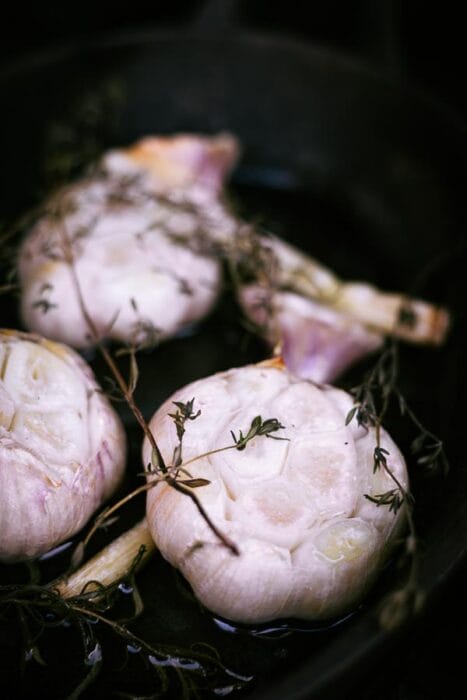 - Optioneel: plaats de look in een schaaltje en overgiet met olie. Plaats enkele takjes tijm en rozemarijn tussen de lookbollen en rooster deze tot de teentjes look zacht zijn geworden.