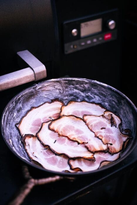 Nu de Tartiflette Royale nagenoeg klaar is, hoef je deze enkel nog af te bakken. Om een mooi gegratineerd effect te bekomen is een BBQ met deksel essentieel. Verwarm de BBQ voor op 200°C vooraleer je de skillet op de BBQ plaatst. Indien gewenst kan je nog wat extra rookhout toevoegen voor een smoky touch, al hoeft dit niet meteen. Bak vervolgens de Tartiflette schotel in de BBQ met gesloten deksel tot de “Tartiflette kaas” mooi gesmolten is en goudbruin begint te kleuren. Dit duurt ongeveer 25 tot 30 minuten. Eenmaal je een mooi gegratineerd effect hebt kan je deze tartiflette afwerken met fijn geraspte zomertruffel en verse peterselie.