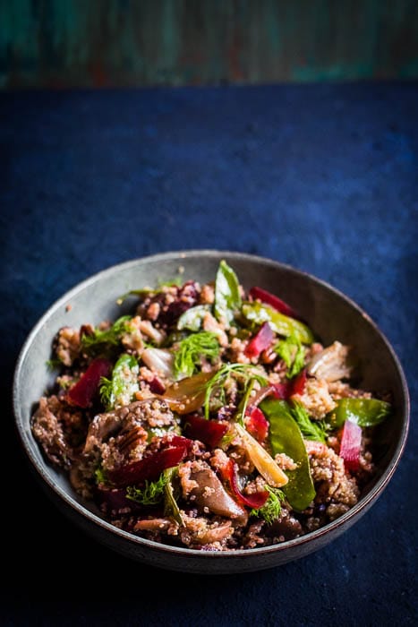 - Meng de groenten en noten onder de quinoa. Werk op het einde af met de zoetzure biet en verspreid het loof van de venkel over de salade.