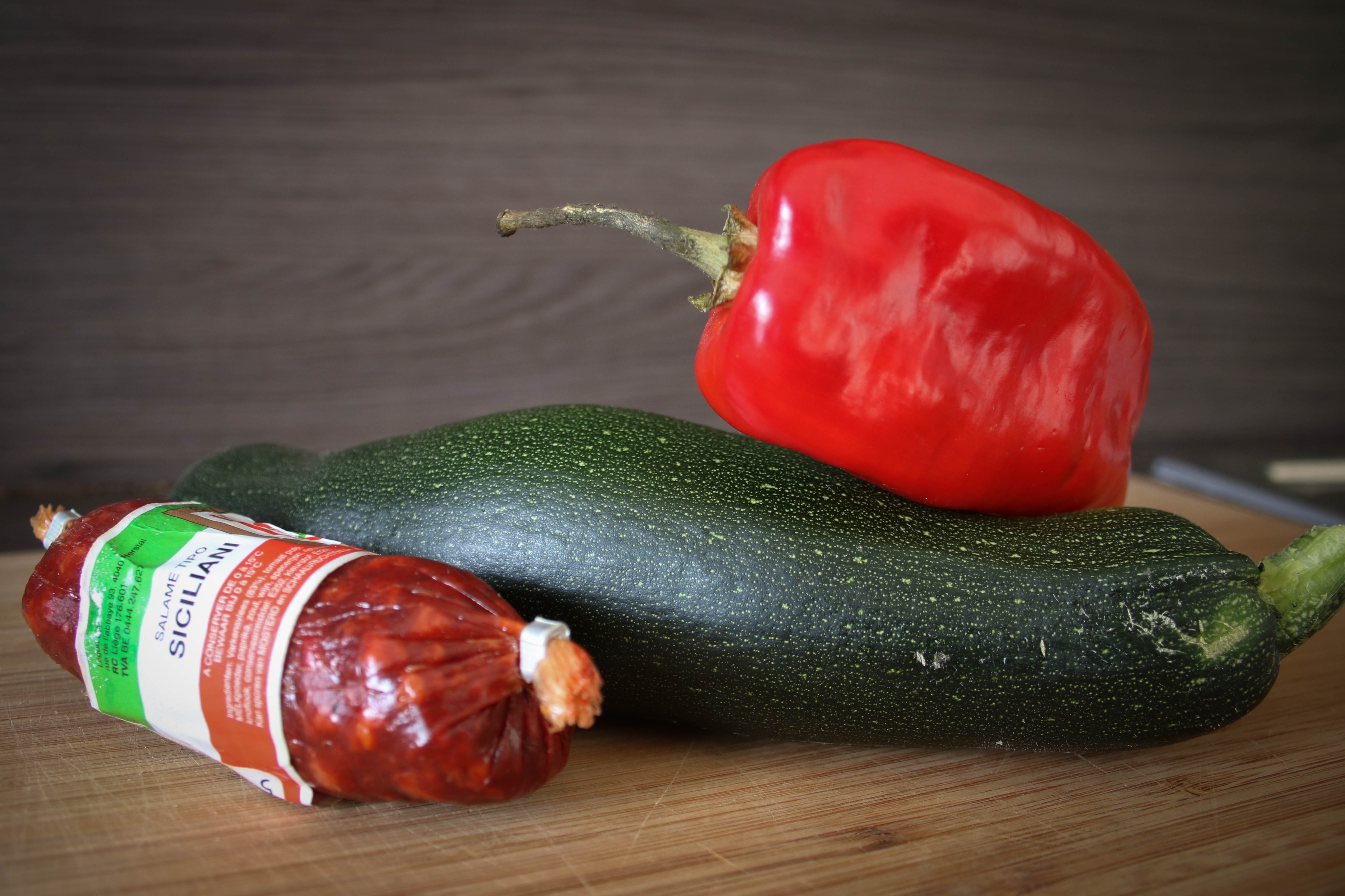 This is the result. Not the most clear picture… But when hungry it has to go fast. The result was good but there is room for improvement! I will use some more grilled bell pepper next time and maybe a little bit extra herbs to enhance the flavours even more. The italian sausage crunch was verry tasteful. Next time I’ll cut them in smaller pieces so the get spread more evenly. The zucchini and peas were really great this way!